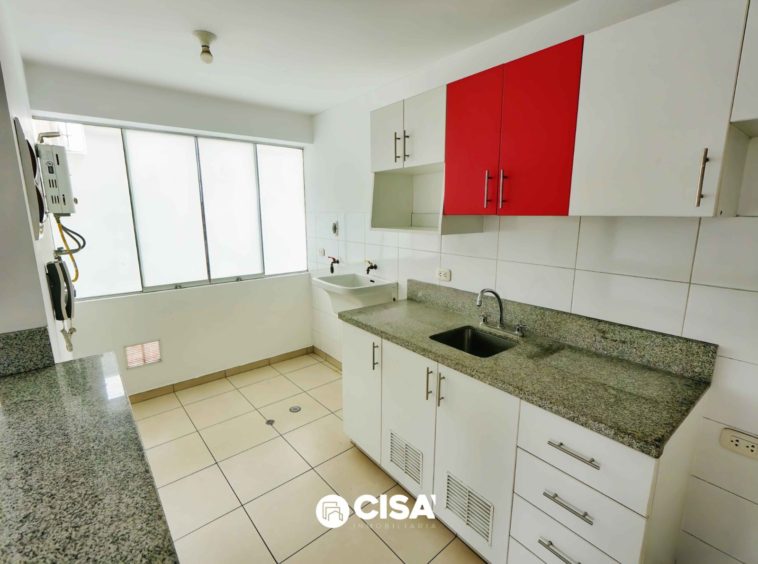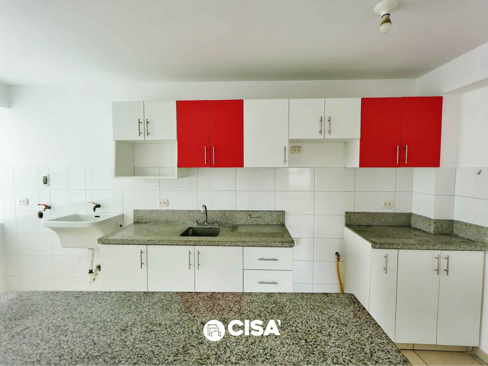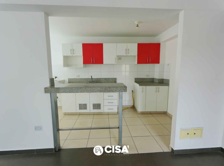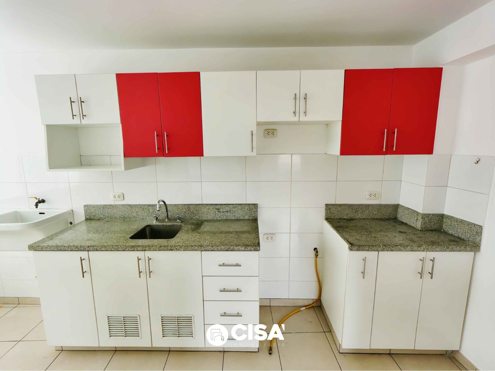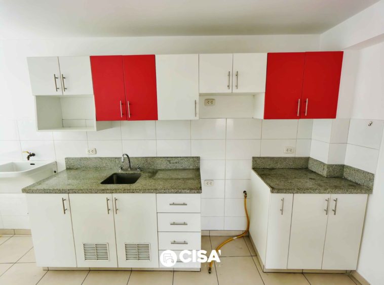 Cocina abierta tipo kitchenette, con barra de granito, muebles altos y bajos cajones y repisas de melamine color blanco y rojo, piso cerámico.